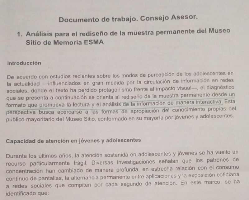 En el Centro de Estudios Legales y Sociales (CELS) confirmaron a este diario que el consejo asesor ya presentó su rechazo a la propuesta oficial —el documento cuya existencia el Gobierno niega— por considerar que altera los objetivos fundamentales del Museo Sitio ESMA.