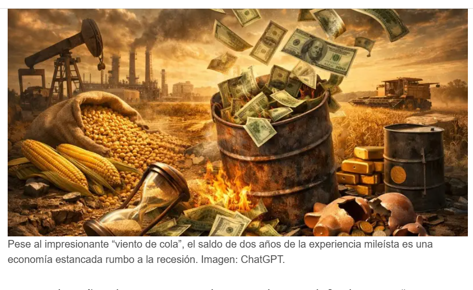 Pese a este impresionante “viento de cola”, el saldo de dos años de la experiencia mileísta es una economía estancada rumbo a la recesión, nula acumulación de reservas internacionales, profundo deterioro sociolaboral, destrucción de empresas y empleos de calidad, aceleración inflacionaria y un ajuste fiscal regresivo que, por la propia lógica del plan económico, se profundiza.