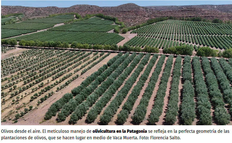 En Añelo, centro neurálgico del petróleo y gas argentino, el verde de 650 hectáreas contrasta con el paisaje rojizo y la aridez característicos del lugar. En ese campo, ubicado en pleno Vaca Muerta, coexisten varias producciones agropecuarias, pero la actividad olivícola destaca en rindes y calidad: elaboran un aceite de oliva que se hizo lugar en el mercado más exigente. El vino y los pistachos son las más recientes apuestas.