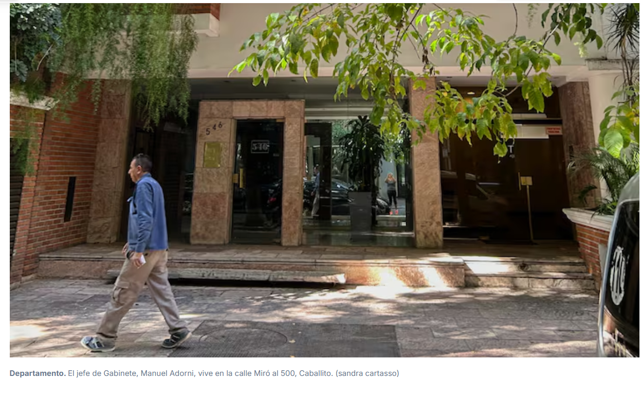 Según lo consignado ante el Registro de la Propiedad Inmueble el valor por el que fue comprado el departamento de Miró sería de 230.000 dólares, cuando es conocido que en esa zona de la Ciudad de Buenos Aires difícilmente haya propiedades por menos de 3000 dólares el metro cuadrado. O sea, lo lógico es que haya costado cerca de medio millón de dólares. Adorni lo adquirió –junto con su esposa– sin desprenderse del inmueble de 115 metros donde vivía antes en Parque Chacabuco ni del que declaró en La Plata (de 107 metros). A nombre de su pareja hay otro, en la calle Bragado al 4700 que había comprado al Instituto de la Vivienda de la Ciudad de Buenos Aires.
